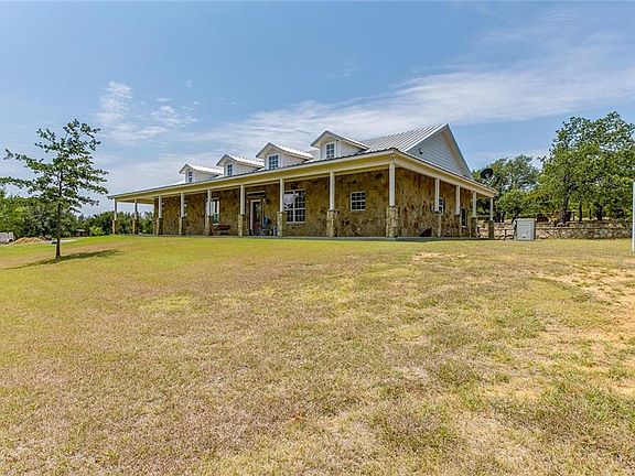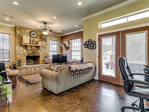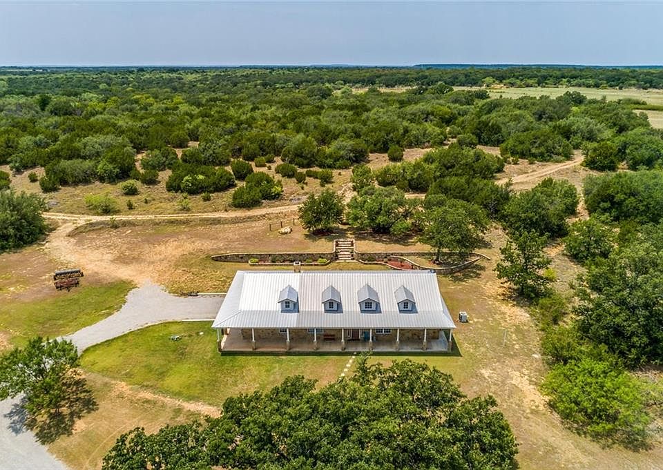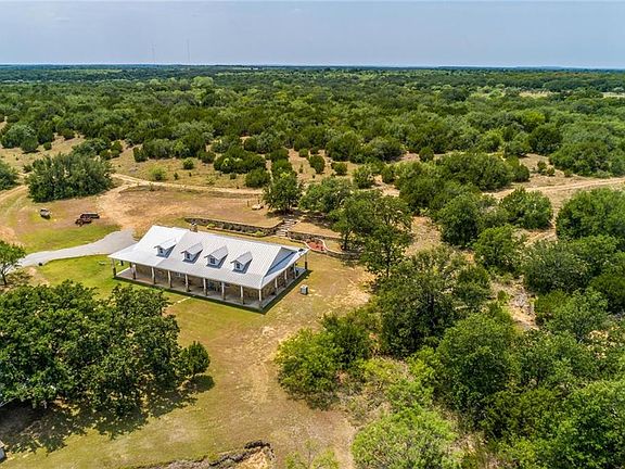 This gorgeous ranch offers a luxury stone 3 bed, 3 bath, 2,054 sf home on 54 acres. Two stock tanks bring in the game along with the mix of thick hardwood oaks. This immaculate custom home is sheathed in custom rock work and has a metal roof. The wrap around porch brings in the wild outside beauty. High ceilings, custom concrete floors, rugged stone front fireplace, crown molding and so much more. This dream kitchen provides a gas cooktop, custom cabinetry with pull out drawers, eat in area and a utility right off of the kitchen. The peaceful backyard boasts a custom rock wall, majestic boulders and a quiet getaway. This HUNTER'S PARADISE is turn key! Hunting blinds and feeders will convey. Breckenridge ISD!
