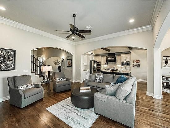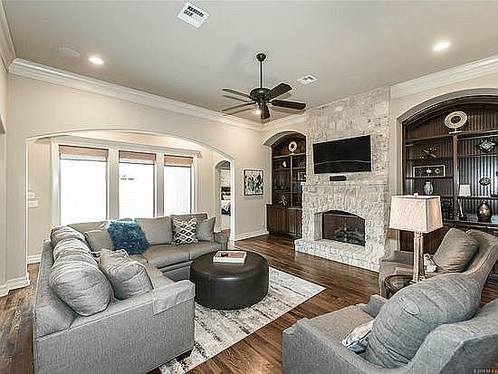 Located in The Legends. Bixby ISD. This immaculate 4/3.5, 3 car garage, stucco home is close to bike/walking trails, shopping, & entertainment. Vaulted ceiling w/ wooden beams. 2 Gas FP in Living & Master. Chef's Kitchen w/ gas Jenn Air, double ovens, walk-in pantry & incredible granite island. Hardwood floors. Oversized Master w/ vaulted ceilings & fp, Office, & Guest w/ bath on 1st level. Flex game/bdrm + theatre room + 2 bdrms up. Hardwood flrs. 2 separate walk-in attic storage areas. Large covered outdoor living w/ fans & natural gas. 3 heating/cooling units/zones w/ wifi thermostats. 3% comm