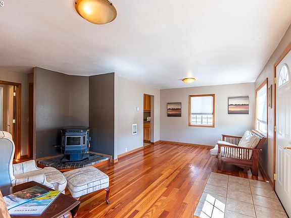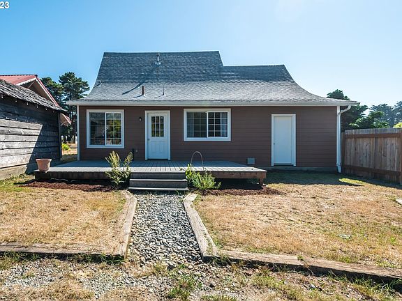 Charming cottage style home including endless possibilities with C-2 zoning for a business adventure! Located front facing Hwy 101 with parking in front or alley access behind. This 2 story 1168sqft 3BD/1BA home offers galley kitchen stocked with appliances, separate eating area, laundry room, comfortable living room with cozy pellet stove, main bedroom, and bathroom are downstairs. 2BD upstairs with room for expansion in unfinished attic areas. Attached 1 car garage is house length. Enjoy the outdoors on the spacious deck to the backyard and parking area. Grocery and shopping center is 1/4 mile, and about 1.5 mile to Bandon South Jetty Park beach access. Schedule your appointment today!