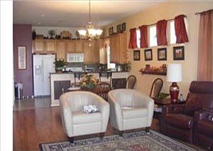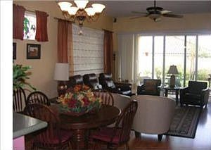 Look no further for the retirement home of your dreams. This beautiful Trillion Model is situated in the 55+ community of Solera Oak Valley Greens. The Gourmet Kitchen is open to the dining and living room with Corian counters. The upgrades include gorgeous high quality Laminiate Floors in the Living, Dining and both Bedrooms. Tile is in hallways, kitchen and both bathrooms. There is a built-in entertainment center plus fireplace is in the living room and a sky light in the guest bathroom. Ceiling fans are located in the living room, both bedrooms and the office/den. The backyard is private, great for entertaining and is low-maintenance. The garage includes storage cabinets and a small work bench. Room for two cars and a golf cart or work area!\r\nThis property is spotless and move in ready!\r\nSolera is a 24 hour guard gated community with many activities at the club house. The club house boasts an indoor walking track and fitness center. The facility includes a pool, spa and much more! The community is close to freeways, outlet shopping, golf courses and is a mere 30 minutes to Palm Springs. Find your heaven in this open floor plan model! Brokered And Advertised By: SUN LAKES REALTY, INC Listing Agent: PATRICIA RANNEY