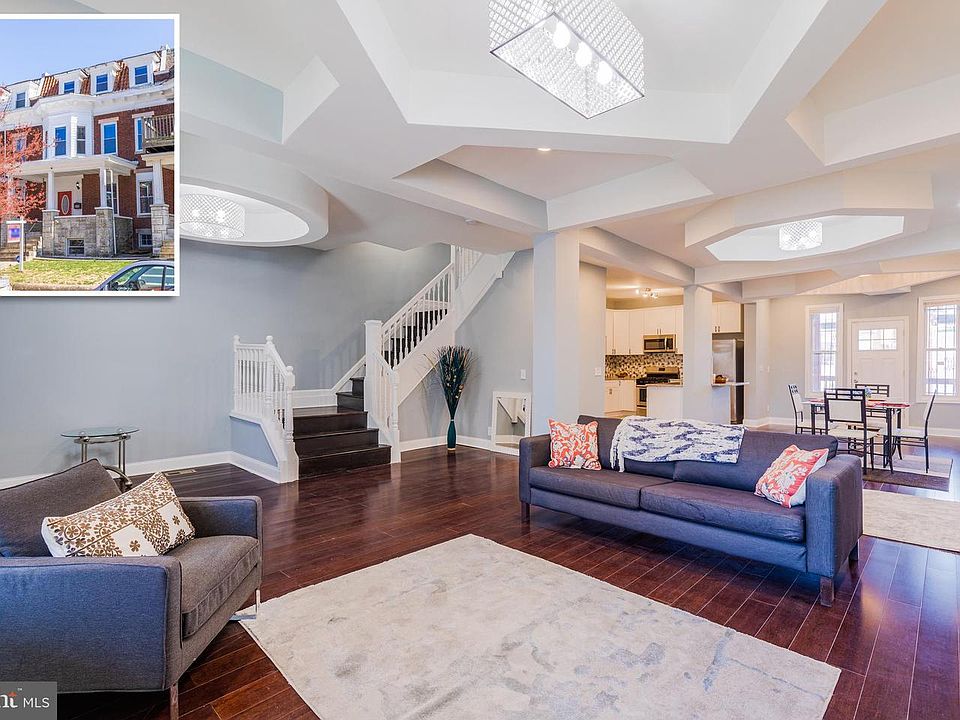 CONTEMPORARY ELEGANCE RADIATES THROUGHOUT THIS 2,600+ SQ. FT. ROWHOME WITH DETACHED GARAGE! The main level features an open floor plan w/ hardwood floors, coffered ceilings, & custom lighting, a designer kitchen w/ breakfast bar, granite counters, ss appliances, & tile backsplash, and a main level half bath. The 2nd level has 3 large bedrooms, 1 full bath, and a rear balcony. The 3rd level Master suite features a spa bath w/ a separate shower, and large whirlpool tub, wet bar area w/ wine fridge, and a rooftop deck w/ sweeping views. The full basement is perfect for storage w/ a painted floor & separate entrance. There is tons of natural light throughout, two zoned heating and air, newer hot water heater, and new BGE meter. Exterior features include updated flood lighting, updated roof, & main level covered porch which overlooks the fenced yard and detached 1 car garage! Perfectly located within walking distance from DoveCote Cafe - a community based Bistro, and Druid Hill Park which features the Maryland Zoo, the Jones Falls walking, running and biking trail, tennis and basketball courts, & a community pool! Click on Virtual Tour to see a 3D Tour!