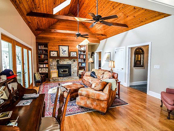PRIVATE NC MOUNTAIN HOME ON 7+ ACRES!! Surrounded by tall hardwoods, this 4 bedroom/ 4.5 bathroom home offers acres of pasture & woods, a pond, covered front & back decks, a great room w/ built-in book shelves, a stone wood burning fireplace, a vaulted ceiling w/ exposed beams, a spacious kitchen, wood floors, laundry on the main level, a living room on the main level & another 1 on the lower level, large workshop on the lower level, master on the main, & 2 additional masters on the upper level.