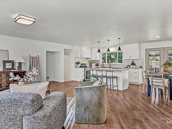 Experience refined living on a rare 1-acre estate tucked away on a peaceful no-through street just minutes from Downtown Eagle, celebrated dining and Eagle Island State Park. This fully reimagined ranch-style residence was taken to the studs in 2025 and showcases a designer kitchen with butler’s pantry, spa-inspired baths, all new finishes and upgraded electrical throughout. The main level offers a light-filled living space, primary suite and two additional bedrooms. The lower level extends the lifestyle with a stylish rec room anchored by a fireplace, office, two bedrooms and a full bath. Exterior enhancements include Hardy plank siding, new roof, soffit, fascia, garage door, patio and deck. A private well supplies the landscaped grounds and sprinkler system with flood irrigation for the expansive pasture—perfect for animals, RVs and toys. With endless possibilities this is a one-of-a-kind Eagle retreat where space, luxury and location converge.