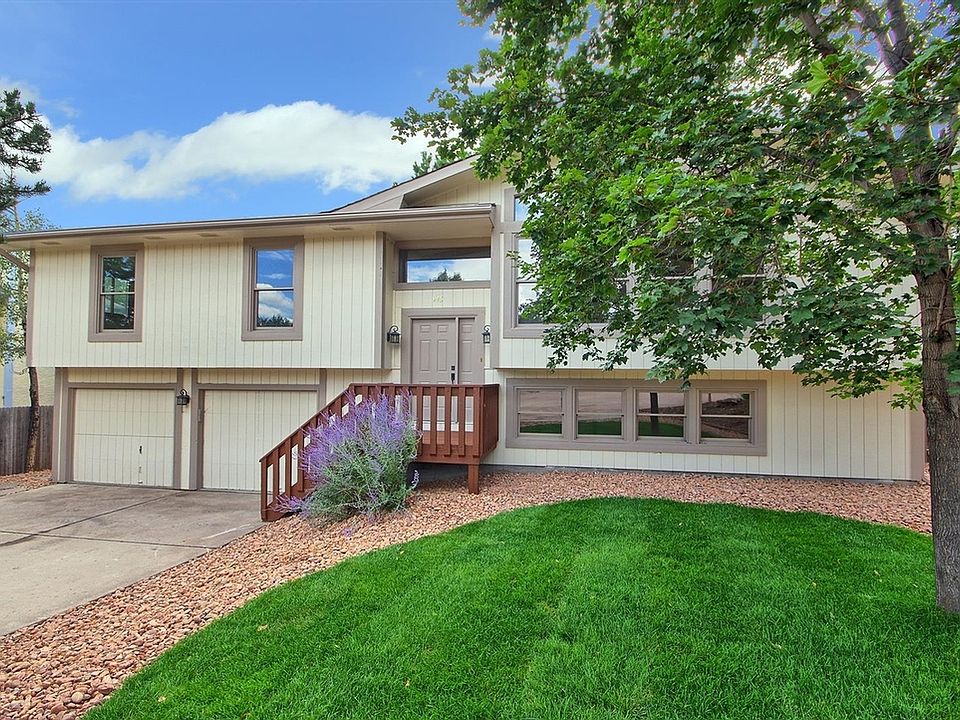 Located in the desirable Rockrimmon community, close by esteemed Foothills Elementary School but tucked away on a quiet cul-de-sac, this 4 bedroom, 3 bath raised ranch floor plan is awaiting new owners! Fresh interior paint, new carpet, and a wonderful blend of formal & casual living spaces featuring indoor and outdoor entertaining opportunities will delight and entice you! Nestled among mature landscaping with large privacy trees in Academy School District 20, offering proximity to all Colorado Springs has to offer! Additional amenities include: Main Level: *formal dining room *expansive great room with beamed ceilings *remodeled kitchen with solid surface counters, sizeable pantry, tile flooring, counter bar seating, huge island and walkout to beautiful brand new upper composite deck and lower deck with large bordering pine tree providing shade and privacy! Upper Level- *master bedroom with ceiling fan, walk-in closet & private en-suite remodeled master bathroom with dual vanities *secondary bedroom with walk-in closet *third bedroom with storage cubby *full bath. Lower Level: *spacious family room with gas fireplace & bookshelves *finished under stairs storage room *4th bedroom *3/4 bathroom *laundry room w/ electric hook-up *oversized 2-car garage *recently updated beautiful landscaping featuring new sod, rock borders and new mulch. Other features to this outstanding property include a Stainmaster warranty on new carpet * new front door * new trim paint on exterior and front porch! *Minutes to I-25 with easy access to Denver, Downtown Colorado Springs and close to Ute Valley Park, neighborhood parks, shopping, dining and anywhere in Colorado Springs - this turn-key home showing true pride of ownership will delight even the most discriminating buyers!