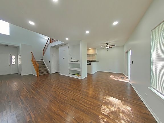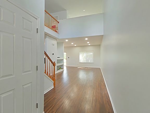 Freshly painted and move-in ready, this home welcomes you with a soaring 2-story foyer and gleaming wood-look flooring. The stunning 2-story living room is filled with natural light and features a built-in entertainment center, perfect for your TV and gadgets. The dining room opens to a sliding glass door leading to a private patio with a wide-open green area - an ideal spot to relax. The updated kitchen shines with white cabinetry, granite countertops, a tiled backsplash, stainless steel appliances, and matching wood-look flooring. Upstairs, discover the owner's retreat with a spacious open loft that includes a closet - flexible enough to use as a home office, media room, or even an additional bedroom. The ensuite master bedroom offers a cathedral ceiling, walk-in closet, ceiling fan and updated private bath. Additional highlights include a roomy 2-car garage, community clubhouse, and outdoor pool. Conveniently located near the Metra and I-88 for easy commuting!