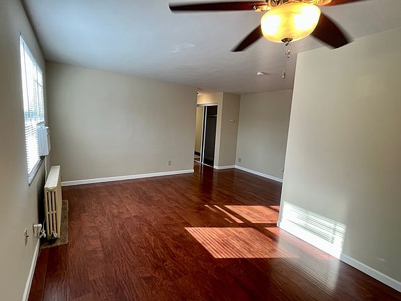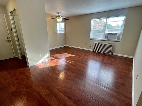 $775 a month with radiator heat included! 1 bedroom, 1 bathroom apartment with lots of closet space, a kitchen with pantry and dishwasher, ceiling fans, two large bedroom closets, and a tiled bathroom. Window AC unit is provided. Living room has hardwood floors, and professionally cleaned carpet in bedroom. Location has some off-street parking, a coin laundry room, secure entrances, and a large yard for recreation. Customer pays the electric bill. Owner provides radiator heat, water/sewer, trash, and maintenance services. Up to 2 cats are okay with monthly pet fee, no dogs please! Non-smoking building. 1 year lease minimum.