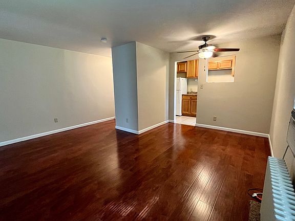 Radiator heat included! 1 bedroom, 1 bathroom apartment with lots of closet space, a kitchen with pantry and dishwasher, ceiling fans, two large bedroom closets, and a tiled bathroom. Window AC unit is provided. Living room has hardwood floors, and professionally cleaned carpet in bedroom. Location has some off-street parking, a coin laundry room, secure entrances, and a large yard for recreation. Customer pays the electric bill. Owner provides radiator heat, water/sewer, trash, and maintenance services. Up to 2 cats are okay with monthly pet fee, no dogs please! Non-smoking building. 1 year lease minimum.