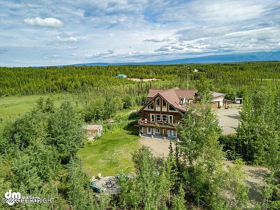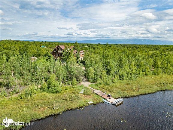 This custom log home Has 2 kitchens, sits on nearly 7 acres and is surrounded by a lake on 3 sides. Situated for maximum privacy and the best of Alaskan living with Stunning mountain views and amazing sunset and Aurora viewing. 3 large bedrooms, ample storage, and large decks are some of the many features of this unique property. The primary suite has a jetted tub, WIC, private deck, and moreThe walkout basement has great lake views and is set up as MIL or income rental. A large detached garage has shop space, and horse stall. Alaska living at its best. (Infloor heating)