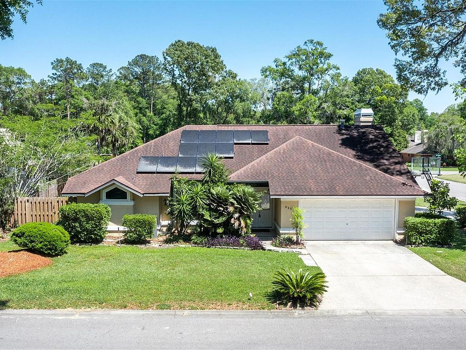 PRICE IMPROVEMENT!!! Gorgeous Renovated Pool Home in the Heart of Southwest Gainesville. Welcome to this beautifully renovated 4-bedroom, 3-bathroom pool home located in the highly desirable Fairfield neighborhood of Southwest Gainesville. Perfectly situated on a spacious corner lot, this stunning residence has been thoughtfully upgraded throughout, offering both luxury and functionality for modern living. Step inside to discover a completely remodeled kitchen designed to be the heart of the home. Featuring gleaming granite countertops, a stylish tile backsplash, new cabinetry, stainless steel appliances, and a convenient breakfast bar with additional eat-in seating, this kitchen is both elegant and practical. The open-concept design ensures seamless flow into the expansive living area, where 10-foot ceilings, recessed lighting, and a wood-burning fireplace create a warm and welcoming atmosphere — ideal for both relaxing evenings and entertaining guests. The home also includes a traditional formal dining room, a dedicated interior laundry room, and a versatile media/flex room that can be transformed into an entertainment center, home office, or second living space. Just off this flex area, you’ll find the fourth bedroom and third full bathroom — a perfect setup for guests, in-laws, or even a private office space. This wing of the home also features a separate entrance via a second driveway, offering added parking, privacy and convenience. The spacious master suite is a true retreat, complete with direct access to the pool area — imagine stepping out for a quiet morning swim or winding down poolside in the evening. The suite features a large walk-in closet, dual vanity with granite countertops, a separate make-up vanity, and a luxurious two person, walk-in tiled shower with bench seating, delivering a spa-like experience right at home. Step outside to your own private oasis — a sparkling in-ground pool enclosed by a screened lanai, perfect for outdoor entertaining or relaxing with family. A poolside bathroom offers easy access and functionality, doubling as a convenient cabana bath. Beyond its aesthetic appeal, this home is loaded with practical upgrades: a $60,000 solar panel system virtually eliminates your electric bills, while recently replaced low-E windows and an insulated, attached 2-car garage provide year-round energy efficiency. A 2017 architectural shingle roof adds even more peace of mind. Fairfield offers an ideal Gainesville location — close to top-rated schools, parks, and just a short drive to UF Health Shands and North Florida Regional hospitals. Enjoy convenient access to shopping, dining, and entertainment at nearby Haile Plantation Village Center, Celebration Pointe, and Butler Plaza.Don’t miss the opportunity to own this truly move-in ready, meticulously renovated home in one of Gainesville’s most sought-after communities. Schedule your private showing today and experience the perfect blend of comfort, style, and modern living!