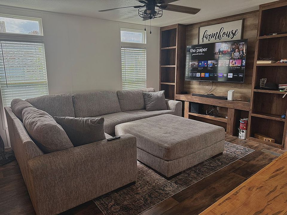 • Open floor plan featuring a recently updated living room equipped with built-in entertainment center and shelving