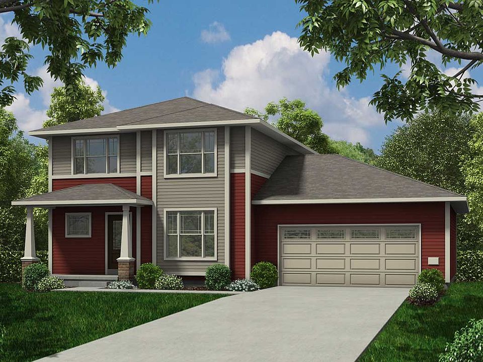 Image is representative of home. Amenities: Prairie style 2-story home, with 4 bedrooms and 2 1/2 bathrooms, Open Concept floor plan, Victorian Gray and Silver Grey colored Mastic siding, Hallman Lindsay(R) "Place of Dust" paint with Orange Peel Texture, Custom Auburn Ridge(R) cabinetry, doors and trim throughout the home, Shaker style kitchen cabinetry includes hardware, crown moulding and soft close drawers/doors, Kohler(R) plumbing fixtures in the kitchen and bathrooms, Kitchen features large island with a breakfast bar, Mannington Restoration Laminate flooring throughout kitchen, dinette, foyer, and great room, Owner's suite features tray ceiling, walk-in closet, plus owner's bath, Versatile flex room can serve as a home office, library, or music room, Convenient main floor laundry, 14x12' Patio with convenient access from the dining area, Basement 3/4 bath rough-in