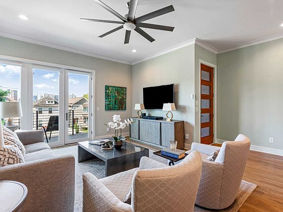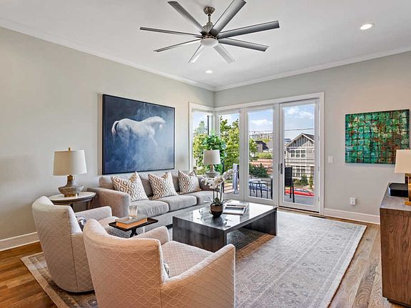 Stunning Contemporary Living in the Gulch w/ Breathtaking views of Nashville's skyline! Features open concept living w/ high-end finishes including Pella windows & doors, & a bonus room w/ wet bar, garage door opening to rooftop deck on 3rd floor. A gourmet kitchen w/ shadow storm quartzite counters and Kitchen-Aid appliances & a spacious master w/ balcony, luxurious, spa-like bath, & walk-in closet! Attached 2-Car Garage, custom built-in storage & a partially finished basement for a gym.