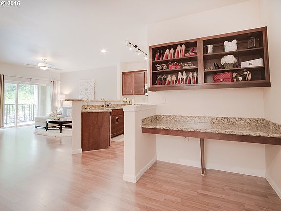 Beautifully maintained condo with great floor plan!Hardwood & tile floors with updated light fixtures make it a warm & inviting space.Kitchen has large pantry, granite counters & stainless steel appliances.Built-in desk & upper cabinet are perfect for office space.Balcony looks out onto treed area and has a storage room.Laundry room adds convenience. Oversized garage has extra storage too!Onsite pool & gym & close freeway access too!