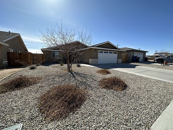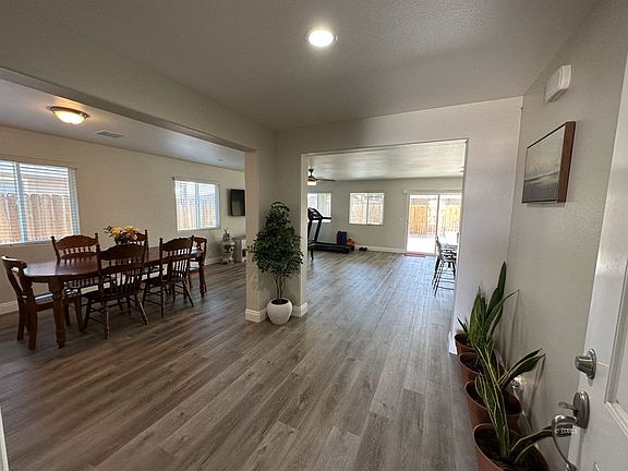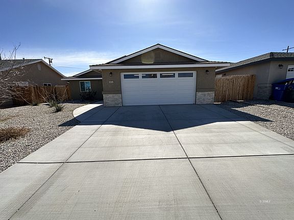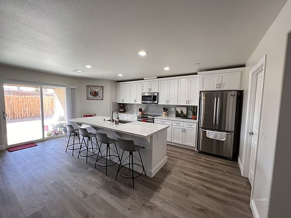 Beautiful1,882 square foot newer home with 4 bedrooms and 2 full bathrooms, central A/C, all electric with owned solar! Open concept floor plan with dual pane windows, grey-toned vinyl plank flooring throughout, and carpeted bedrooms. The stunning kitchen includes soft-close cabinets, stainless steel appliances, white quartz counter tops, recessed lighting, and separate pantry. Luxurious master bathroom includes a garden tub and double vanity. It features a 2-car fully finished garage, a covered patio in the backyard, and low maintenance xeriscape front yard.