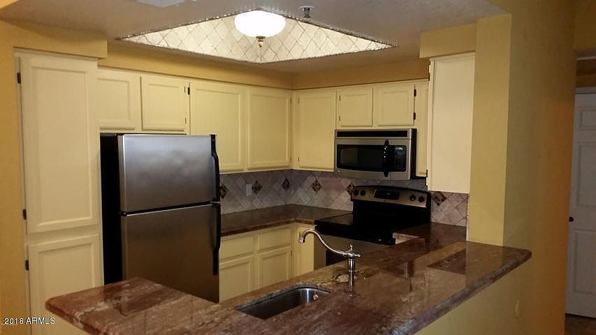 Big luxury in small space! Come see this conveniently located 1 bedroom in Scottsdale. Features: Granite counter tops, stainless steel appliances, Travertine and slate tile flooring, stacked stone fireplace, nice size front patio, and location is close to grocery, dining and greenbelt/biking path.