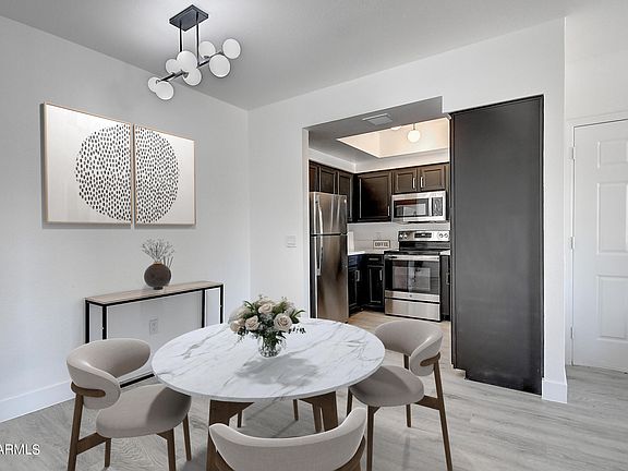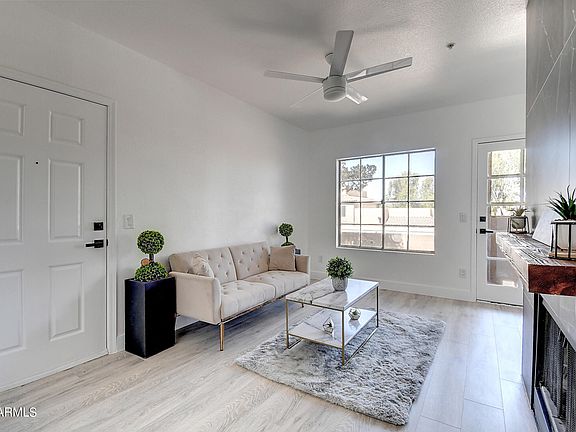 Welcome to this beautifully remodeled 1 bedroom condo, located in a prime Scottsdale location and boasting modern amenities and luxurious finishes. The sought after community of Aventura Features lush green common areas, community pool/Spa, clubhouse, fitness center, tennis court and community BBQ grills. As you enter the unit, you'll be greeted by an open and airy floor plan complete with stunning new flooring, a luxe tiled fireplace and fresh neutral paint throughout. The living area is spacious and bright, featuring large windows that flood the space with natural light.The fully renovated kitchen is complete with high-end stainless steel appliances, sleek quartz countertops, and ample storage space. The adjacent dining area provides the perfect space for meals & entertaining guests under a stylish light fixture. Your bedroom is generously sized including and a walk in closet with built-in shelving. The bathroom has been completely updated with new fixtures, flooring, and a spa inspired modern floating Vanity.Additional features of this condo include in-unit laundry, assigned parking, and a private balcony with stunning views of the surrounding area. Don't miss your chance to make this stunning remodeled condo your new home!