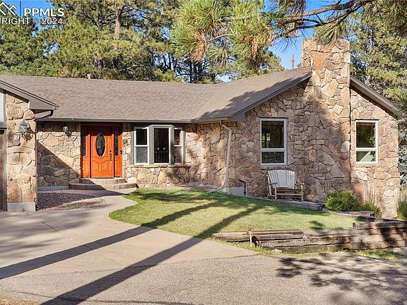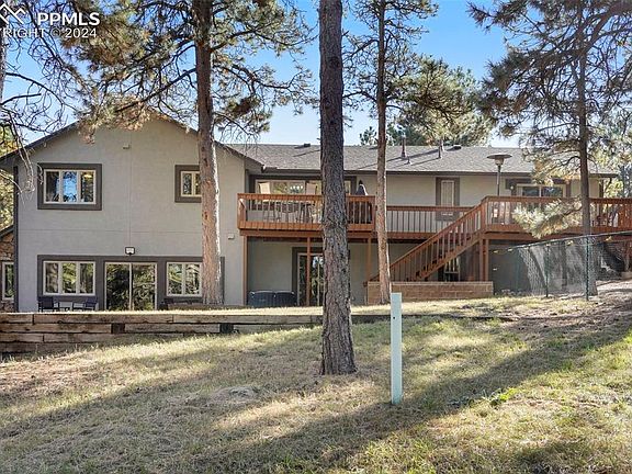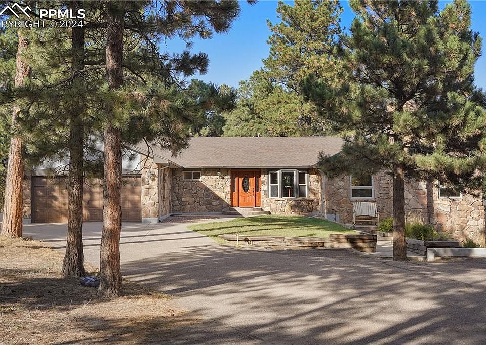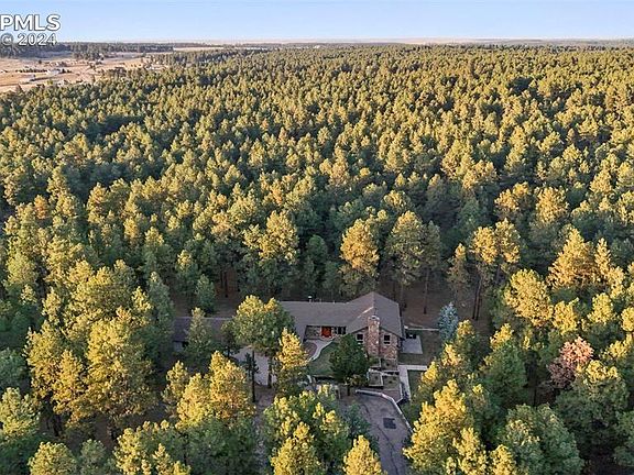 Expansive Black Forest custom rancher and 25x25 detached heated RV garage perfectly positioned in the middle of a gorgeous heavily wooded 5 acre parcel with towering ponderosa pines and blue spruce providing you immense privacy. Almost 4,700 square feet with a finished walk-out lower level. All paved roads to the property and asphalt driveway. Two laundry areas - one on each level. The main level is filled with natural light from the numerous large windows, hardwood floors throughout most of the main level, a wood burning fireplace with an entire wall surround featuring natural stone that gives the perfect charming Colorado feel. Two dining areas. The kitchen is well appointed with custom high end cabinetry, tons of recessed lighting, slab granite counters, tumbled marble backsplash, stainless appliances including a gas cook-top, warming drawer and a custom vent hood. Main level primary suite with walk-out to back deck, walk-in closet w/ built-in laundry and a 5 piece bath featuring a double vanity, large soaking tub and oversized shower w/ multiple shower heads. Finished walk-out lower level with a huge family room that features a wall of windows, a wet bar and enough space to fit a pool table, game table and a family room areas. Two main level bedrooms and three lower level bedrooms. Multiple outdoor entertaining areas which are private and have serene views of your surrounding forest. Spacious main level deck and multiple lower level stamped concrete patios. The grounds are gorgeous and well thought out with multiple tiered gardening beds, fenced dog yard, stone and stucco retaining walls, lush green grasses and an abundance of trees. Award winning School District 38. No HOA. Low maintenance stucco and stone exterior. Recently painted interior and exterior. Great access to Highway 83 and I-25 making a quick commute to Colorado Springs or Denver.