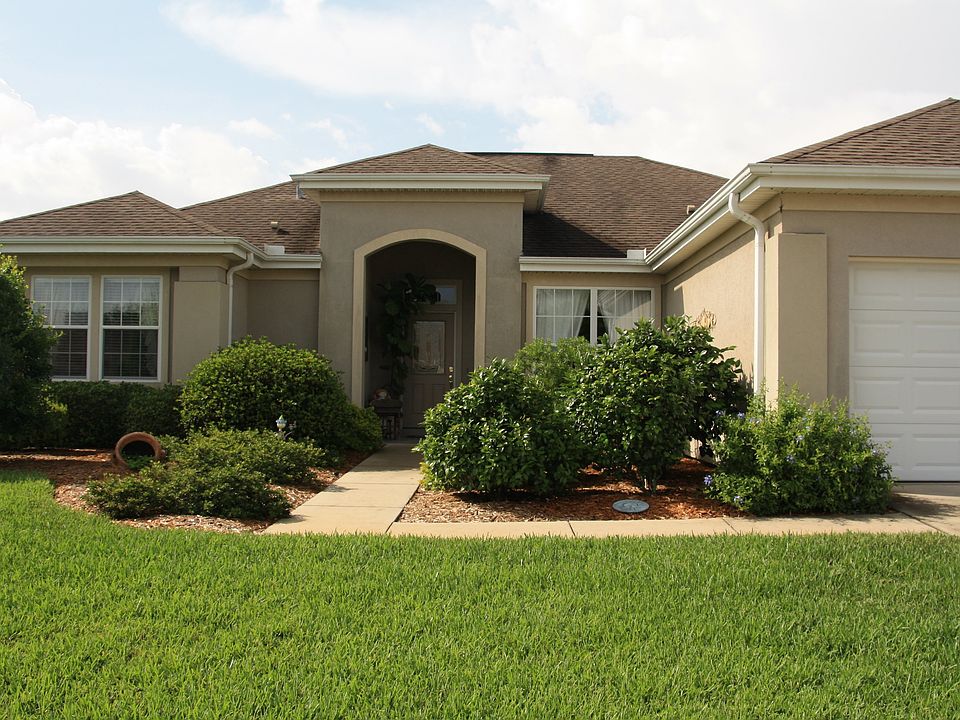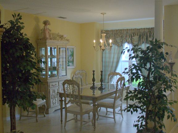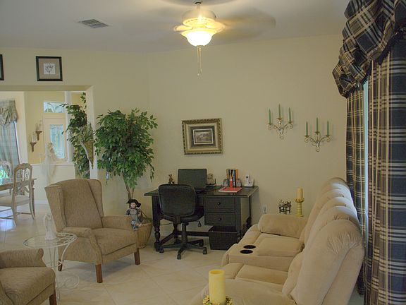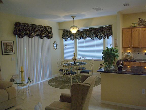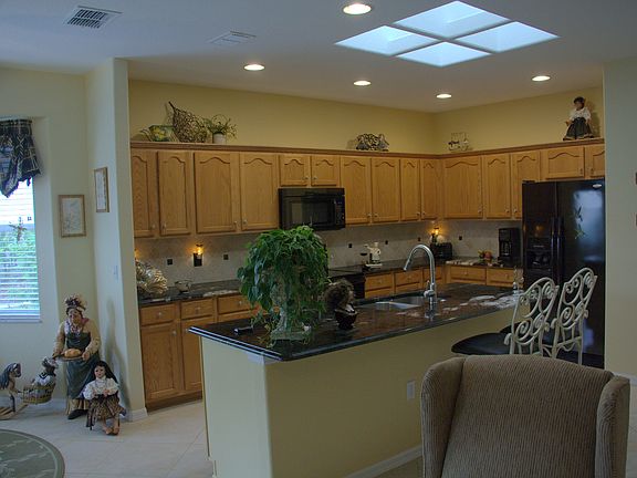 This beautiful home is located in the Del Webb's Spruce Creek Golf & Country Club, a very active adult community. The sky-lighted kitchen has been recently remodeled to include oak cabinetry and dramatic granite counters. Adjoining the kitchen is a bay-window breakfast nook and a wonderful combination family room/office area. A sliding glass door leads to an enclosed lanai, an extension of the homes living area. The glass front entry opens into a formal dining room and charming living room. The bay-window master suite has a full bath and an expanded walk-in shower, enclosed water closet, double sink vanity and walk-in closet. Floor coverings include Berber carpet in the master suite and guest bedroom with the remainder of the home tastefully done with 20 inch Italian porcelain tile laid on the diagonal. This home has been meticulously maintained. The air-conditioner was replaced in 2005 and the exterior and all interior walls were painted in 2010. All interior and exterior door hardware, cabinet pulls and bath accessories were upgraded in 2014. All appliances including refrigerator(2), washer/dryer and window treatments remain with the home. Home furnishings are available for purchase.
