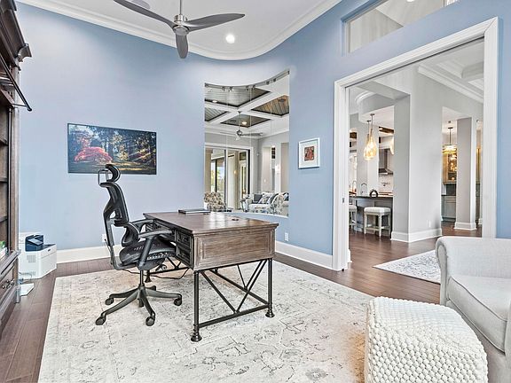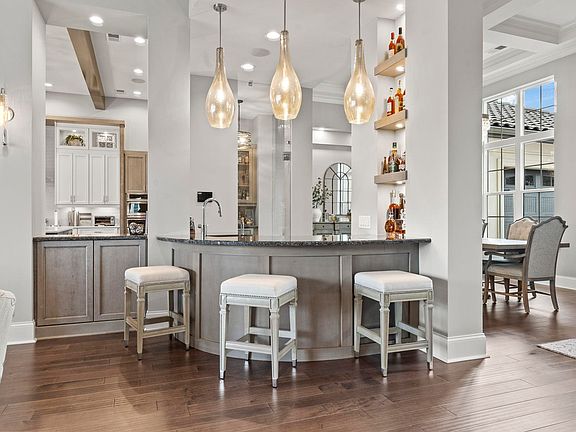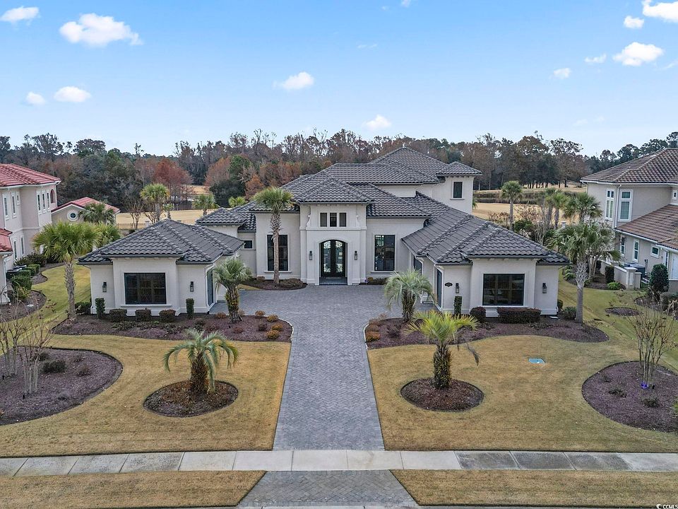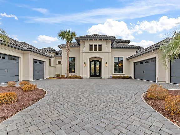 This magnificent home, located in the exclusive members-only section of Grande Dunes, is a testament to custom craftsmanship and meticulous attention to detail, best appreciated in person. This exceptional property features a rare five-car garage and spans over half an acre, boasting an infinity pool with a westward view over the golf course and clubhouse. Upon entering, visitors are welcomed by soaring cathedral ceilings and a spacious open floor plan. The front office, just off the entryway, is adorned with pocket doors and a custom glass window overlooking the living space. The formal dining room dazzles with unique chandeliers and custom remote-controlled window treatments. A built-in wet bar, complete with a wine fridge and bespoke cabinetry, elegantly displays a collection of fine spirits. The kitchen, illuminated by in-cabinet lighting from floor to ceiling, offers ample storage with its expansive island and walk-in pantry. Adjacent to the family room, an eat-in kitchen area provides a serene setting for breakfast amidst lush landscaping or dinner by the warm glow of the fireplace. Wall-to-wall sliding glass doors in the living areas can be opened on beautiful days, with remote-controlled screens enclosing the patio for an extended outdoor experience. The formal living room, also featuring sliding glass doors, a built-in gas fireplace, and beamed ceilings, facilitates seamless entertaining. The primary suite wing, situated on the opposite side of the home for utmost privacy, is accessed through a double-doored hallway, leading to a bedroom with tray ceilings, patio access, and an opulent en suite bathroom complete with a soaking tub, floor-to-ceiling tiled shower, dual-sink vanity, and a dedicated sitting area. The ground floor conveniently offers a half bath with direct access from the pool area. Additionally, two bedrooms featuring en suites and breathtaking views of the backyard are situated on the first floor. An expansive laundry room, complete with a barn door, adjoins the three-car garage. Ascending the stairs, you'll find another bedroom, an extended recreational room with a second bar, and floor-to-ceiling sliding glass doors leading to a grand balcony that overlooks the property. Adjacent to the recreational room is a space perfect for a home theater. Extra storage is accessible in the attic through this room. The outdoor area, with its multiple fire bowls and sunset views, creates the illusion of a private retreat. It includes a custom-built grill, a complete kitchen with a refrigerator, and a tap for your preferred local beer. This coveted location provides access to an opulent beachfront clubhouse, offering a full dining experience and three inground pools facing the pristine sands of Myrtle Beach. Nestled among top-tier restaurants, entertainment, and shopping venues, we invite you to 9451 Bellasera Circle to discover the elegance and ambiance of this bespoke home.