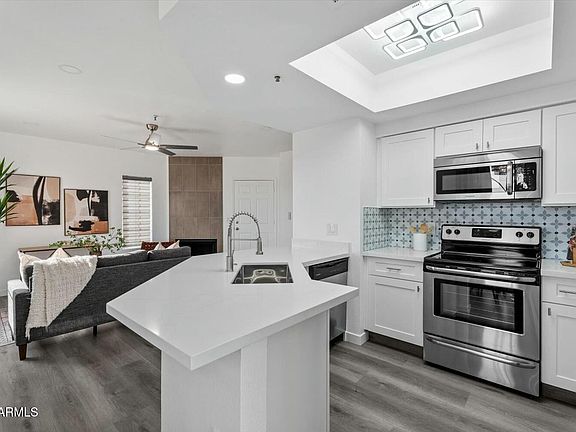 Gorgeous designer remodel located at Aventura in North Scottsdale! This remodeled home has new floors, paint, Calacatta Rafeal quartz counters, faucets, new kitchen sink, premium soft close kitchen cabinets, lighting, fans, newer kitchen appliances, mirrors, washer & dryer, bathroom vanities, toilets, fireplace, newer roof, AC 2021, new premium windows, plus more! The Aventura is located in North Scottsdale close to amazing shopping, dining, and entertainment. Easy to get around town with access to the 101 freeway less than a mile away. This resort style community offers an 3 inviting heated pools, hot tubs, fitness center, clubhouse, game room, tennis, pickleball, plush landscape, BBQ areas, secure bicycle storage, plus more. Don't miss a chance to own this designer Scottsdale dream home