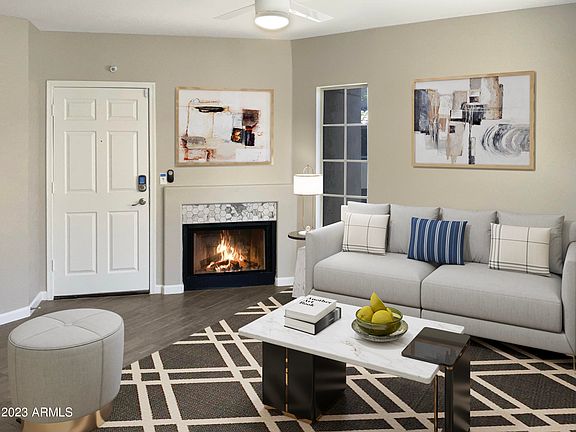 Fantastic 2 bedroom home in sought after central Scottsdale location recently refreshed. The kitchen features stone counters space, new backsplash, breakfast bar, stainless steel appliances making cooking and entertaining a delight. New remodeled bathrooms! Flow into the living room featuring a cozy fireplace, perfect for entertaining. Relax in your primary suite, complete with a walk-in closet, and an en-suite bathroom with spacious layout. Lush green landscape surrounds this beautiful house. Don't miss this incredible opportunity.