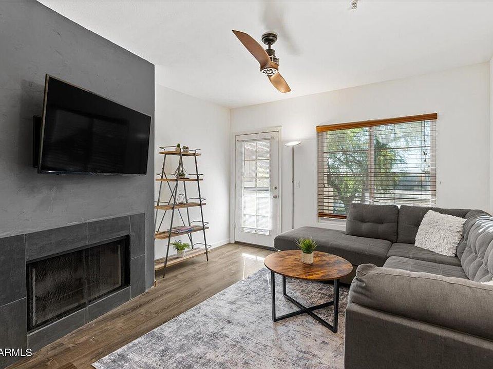 Motivated seller, bring all offers! Recently upgraded floor-plan with LVT and wood burning fireplace. Kitchen comes with all appliances and has picture window overlooking serene grassy area. Living room opens to covered balcony. Nice sized master bedroom with walk-in closet. Updated bathroom. Great North Scottsdale location-situated on 20 acres of beautifully landscaped property, including, tennis courts and PickleBall courts. This condominium is located within minutes of some of the best shopping and dining in the city. Additional property features include 3 swimming pools, two spas, state-of-the-art fitness center and clubhouse. Mid-term rentals (90 day min) allowed by HOA!