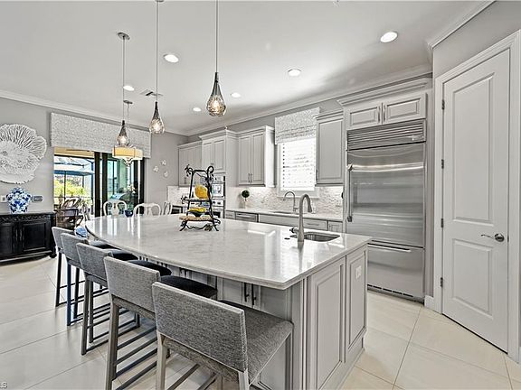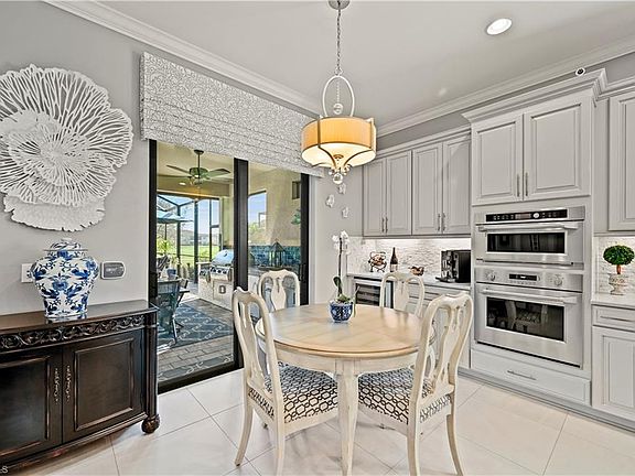 The Esplanade Golf & Country Club is the definition of luxury and resort style living at its finest. This highly sought-after Lazio floor plan is no exception. This immaculately maintained, one owner home, boasts three spacious bedrooms, three bathrooms and a tandem three car garage with epoxy floors. 9452 Montelanico Loop is being sold with its high-end furnishings and comes with a full golf membership. Positioned on the 16th fairway with green views upgrades to the home include but are not limited to Hunter Douglas plantation shutters throughout, tankless ranai hot water heater, designer light fixtures/fans, Monogram kitchen appliances, upgraded tile flooring, extended breakfast nook and custom landscaping. Hurricane windows are accompanied by storm smart hurricane protection power screens with Generac 22kw standby generator. Relax in your wine room after a long day while you sit by the linear three-sided fireplace, letting your cares slip away. Enjoy your oversized saltwater pool with spa on your extended covered lanai. The custom Fire Magic outdoor kitchen is one of my favorite features and is a chef's dream.