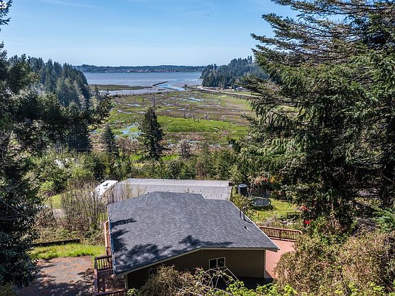 Impressive bay views from this country setting home! Tucked away at end of street location allows for privacy in this small neighborhood located 3.3 miles from Hwy 101 leading back to city center. Enter this beautiful home and notice the vaulted beamed ceilings, immediate bay views from the living room and windows on every wall. Dining area just off kitchen with SS appliances, bar seating leading to sizeable wraparound deck access. Enjoy the outdoors, entertain family and friends and take in the water views! 2 bedrooms downstairs one with shared laundry area including ample storage space, and full bathroom. Private main bedroom upstairs with en suite bathroom and separate balcony. A must see! ***NO DRIVE BY'S & BY APPOINTMENT ONLY***