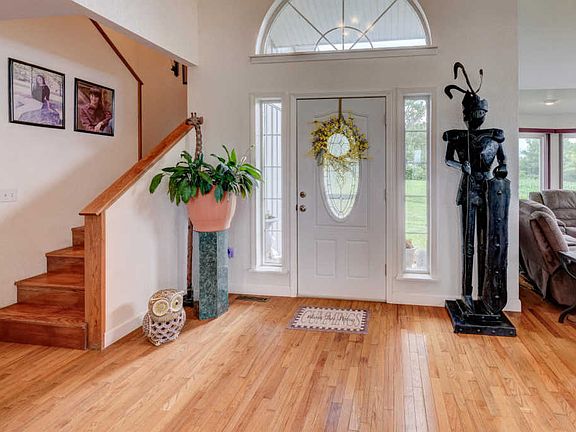 Come and tour this charming country home. She's got it all from the fresh country air to the welcoming feeling when you walk in the door. The large bay windows allow abundant sunshine to flood the open floor plan. Four bedrooms, two and a half baths, two family rooms, a bonus room, fireplace and lots of storage closets ensure that this beauty won't be on the market long. Outside boasts a large patio space with two gazebos and a grill overlooking corn fields with views of both the sunrise and sunset creating the perfect stage for entertaining. With an attached two car garage, fenced area, and an additional storage building on three acres this home can't be beat.