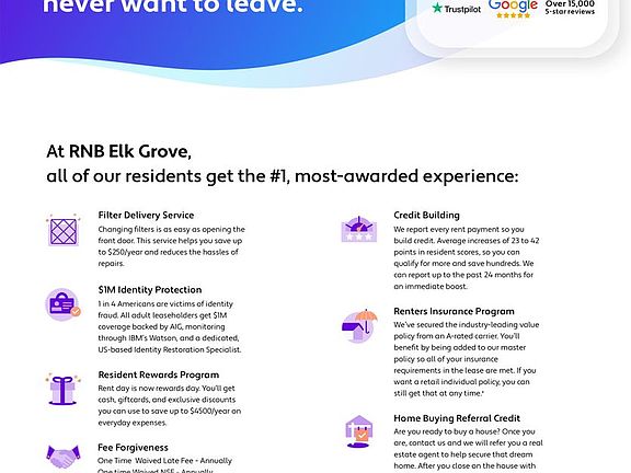 Note: The total monthly cost of the Resident Benefits Package is all-inclusive. No discounts are provided if an element of the package is not applicable due to property-specific limitations.