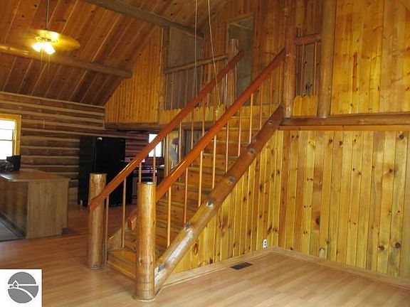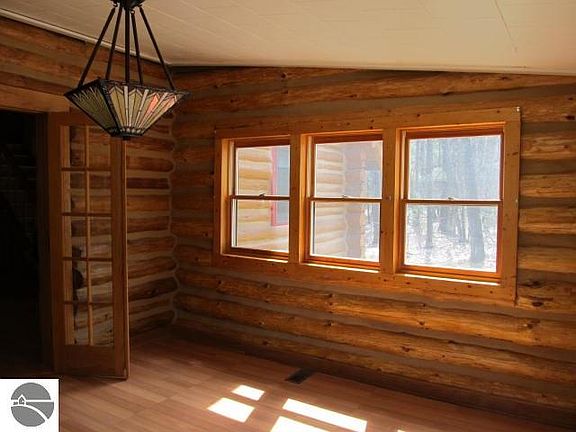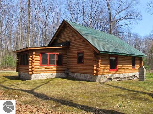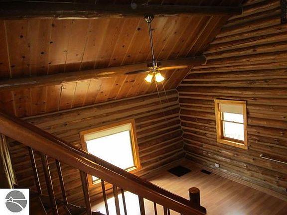 Log Cabin in the woods....Sitting on just under 5 acres but backs up to State land this full log home has a main floor bedroom, sunny sitting room, and natural gas. The second bedroom is located in the enclosed loft. The home has a newer metal roof, well, furnace, and water heater. Plenty of storage space in the unfinished basement, sheds, and attached garage. Property although wooded has a cleared area for a garden