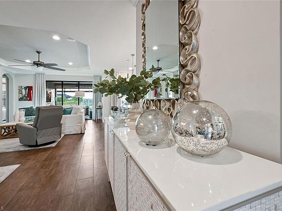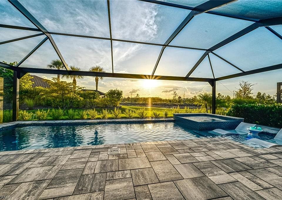 "ITS LIKE STEPPING INTO A NEW MODEL HOME " TURNKEY, FURNISHED, EXQUISITE FURNISHINGS PLUS A GOLF CART AND FULL GOLF MEMBERSHIP! THIS CUSTOM " LAZO " model has an EXTENDED GARAGE AND OVERSIZED LANIA. 3 bedrooms, 3 bathrooms, office with french doors and built-ins a soothing pallet of colors, crown moulding, wood like tile floors through out. Center Island kitchen with quartz counters. FULL HOUSE GENERATOR, WATER PURIFICATIION SYSTEM,TANKLESS WATER HEATER, STORM SCREENS. COMPLETED 2023 A TOTAL TRANSFORMATION OF BACK YARD which took a year to obtain permits, & design sleek contemporary pool/spa, with sun-shelf and 2 ledge loungers, dazzeling glass tile, accent lighting, fountains conviently operated from your mobile phone. Peaceful & perfect for entertaining with built in gas grill, bar (all new lanai & pool pavers) and picture frame cage. Private location with endless views of preserve, lake and sunset skies.Enjoy Esplanade golf and Country Club active lifestyle including 14 miles of bike and walking trails, pickle ball, bocce and tennis courts, tropical resort pool, fitness center, 2 private pools and 18 hole golf course. Close to shopping and 20 min. international airport.