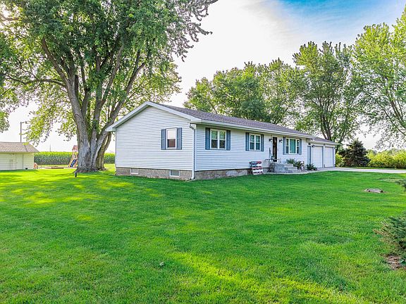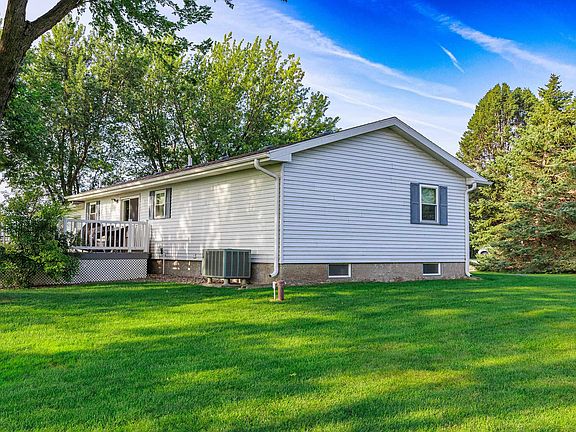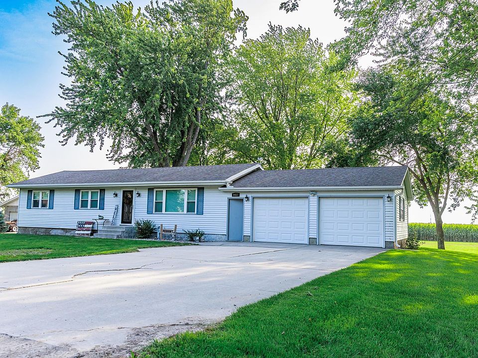 Ranch style home on 1.3 acre corner lot offering privacy with no neighbors to the east or south. Fully renovated interior features a spacious primary suite with ensuite bath and walk-in closet. The main bathroom was also recently remodeled. Kitchen and bath include custom oak cabinetry, with solid oak doors throughout the main floor. Kitchen upgrades completed in 2024 include new countertops and sink. An attached 26x24 garage plus an additional 24x24 detached garage provide ample storage and workspace. Outdoors, the property includes an underground pet fence, underground sprinkler system, and east-facing deck for morning and evening enjoyment. Basement offers potential to add another bedroom. New roof to be installed prior to closing. Located just South of Shell Creek School in the low tax Lakeview district.