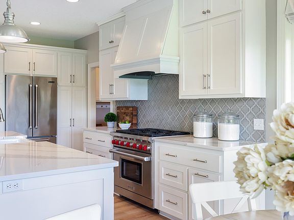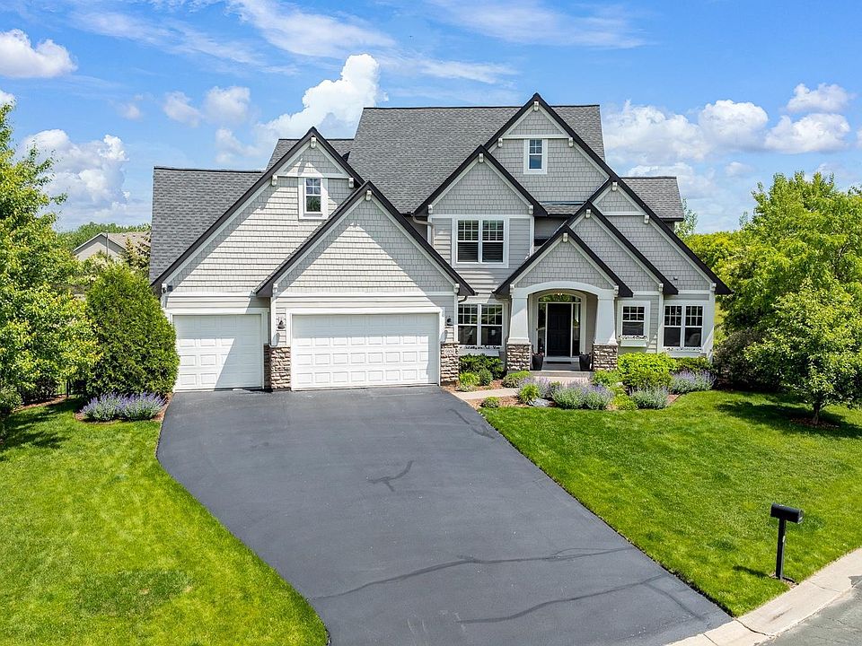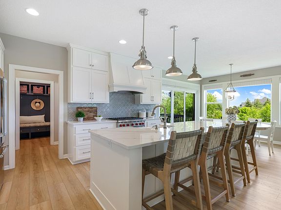 Absolutely stunning 2 story shows like a model. Nestled on a cul-de-sac, it has gorgeous curb appeal with angled garage, Hardie and stone front. Great open floorpan with large rooms. Chef's kitchen with enameled white kitchen, quartz counters, Wolf range and wood vented hood. Finished on all 3 floors. All new flooring throughout. New staircase with white oak rails and metal balusters. Walkout lower level with full bar, fireplace, built ins. Covered deck. Mud room with lockers. Main floor office and pocket office behind kitchen. Formal and informal dining. Knock down ceilings. New roof, furnace, AC. Heated and insulated garage. Fenced yard. Lushly landscaped. Brick paver patios. Beautiful views of city owned land and pond.