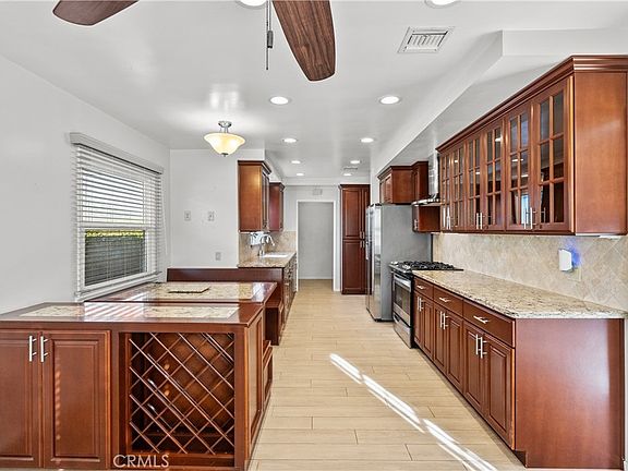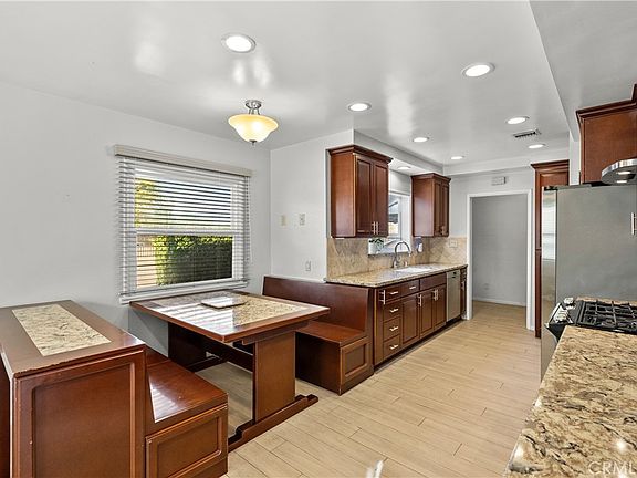Nestled in the highly sought-after Walnut Cove enclave of Northridge, this delightful mid-century home is ideally positioned on a peaceful cul-de-sac, surrounded by beautiful residences that foster a true sense of community. This home offers a perfect blend of timeless charm and modern upgrades, with three spacious bedrooms, two updated bathrooms, and a sparkling swimming pool for year-round enjoyment. As you approach, a welcoming front porch sets the tone for what lies inside. Step through the front door and immediately take in the home’s original hardwood floors and tasteful upgrades that enhance its mid-century appeal. The beautifully remodeled kitchen serves as a true centerpiece, featuring sleek granite countertops, custom cabinetry, a stylish backsplash, and a breakfast nook. High-end stainless steel appliances, including a gas oven/range, dishwasher, and refrigerator, complete this culinary space. Entertain guests in the separate dining room, adorned with a handsome ceiling fan and perfect for memorable meals. Adjacent to the kitchen is a convenient laundry room with ample storage and access to the side yard. The spacious living room invites relaxation, offering a cozy fireplace with a raised hearth and mantel, while sliding doors seamlessly connect the indoor space to the backyard patio and pool area—ideal for California-style living and outdoor entertaining. The sizable primary bedroom is a peaceful retreat, featuring dual closets and private access to a beautifully updated 3/4 bathroom with a tiled shower and vanity. Two additional bedrooms are bright and airy, each with generous closet space and hardwood floors. The expansive full bathroom boasts a large dual-sink vanity and a stylish tiled shower over the tub. Step outside to your private backyard oasis, where you'll find a sparkling swimming pool, fruit trees, and a free-standing pergola—perfect for outdoor dining and leisure. Additional features include a two-car attached garage with an automatic door opener and ample storage. The home has also been thoughtfully upgraded with a composition cool roof, raised panel interior doors, updated central air and heat (2021), copper plumbing, an energy-efficient assumable lease solar power system, and a modernized 200 amp electrical panel. Located in one of Northridge’s most desirable neighborhoods, this home offers the perfect opportunity to create lasting memories in a warm, welcoming environment. (some photographs have been virtually staged).