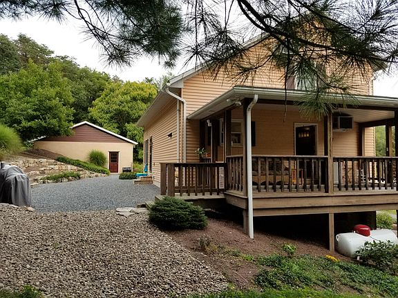 You cannot ask for a more tranquil setting! Enter a tree lined drive, view the beautiful landscaping, plenty of paved parking. This home offers privacy, and a park like feel while still offering 3 levels of living space. The layout may be ''unconventional'' but it therefore lends itself to so many possibilities for privacy with an extended family, or adult children. Nice open concept kitchen / living / dining area with a lovely stone fireplace. Glass doors open onto an expansive wrap around deck, both open and covered. Enjoy watching the wildlife from the covered side screened porch while sipping your morning coffee. With a bathroom on each level and an X Large bedroom upstairs, first floor laundry, and attached garage, PLUS, another X Large detached garage/workshop area, complete with win cellar, this home has all that you could want. Horses permitted, and the grounds are beautiful from every direction. TRULY A MUST SEE PROPERTY!