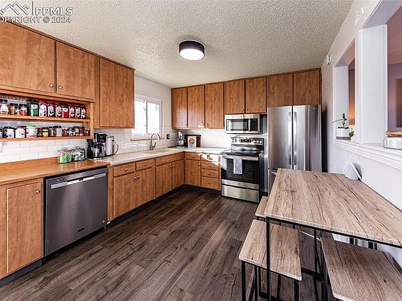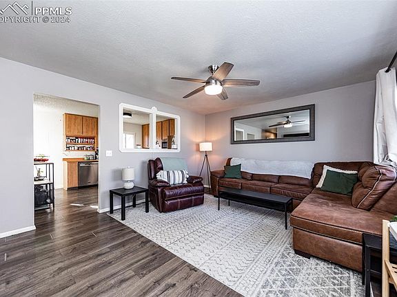 Updated and well maintained 4 bedroom, 2 bathroom ranch home with fully finished basement! Newer siding, cute front porch, ample parking with room for boat or camper storage, and xeriscaping in the front, adds to the curb appeal of this home. Upon entering, you are met with upgraded wood laminate flooring throughout, and a wide open floor plan. The nice sized eat-in kitchen has been updated with stainless steel appliances and subway tile backsplash for a bright, clean look. Three good sized bedrooms and modern full bathroom complete the main level. On your way downstairs, there is a brand new back door leading to the wood deck. The back yard is huge and fully fenced with amazing mountain views. The fully finished basement has a large family room, laundry room with extra storage space, the fourth bedroom, and another updated bathroom with walk in shower. There is also a convenient bonus space on the lower level with glass door that could easily be used as a home office. The siding was replaced in 2021,the porch, railing and concrete were redone in 2021, back deck redone in 2022, new water heater in 2022, new roof in 2022, and new electrical panel in 2022. This home also has Central AC! Close to Memorial Park and Prospect Lake, with easy access to I-25, Colorado Springs airport, downtown Colorado Springs, and all military installations. This home would make the perfect starter home, rental, or full-time residence. It's turn-key, and ready for its next owner!