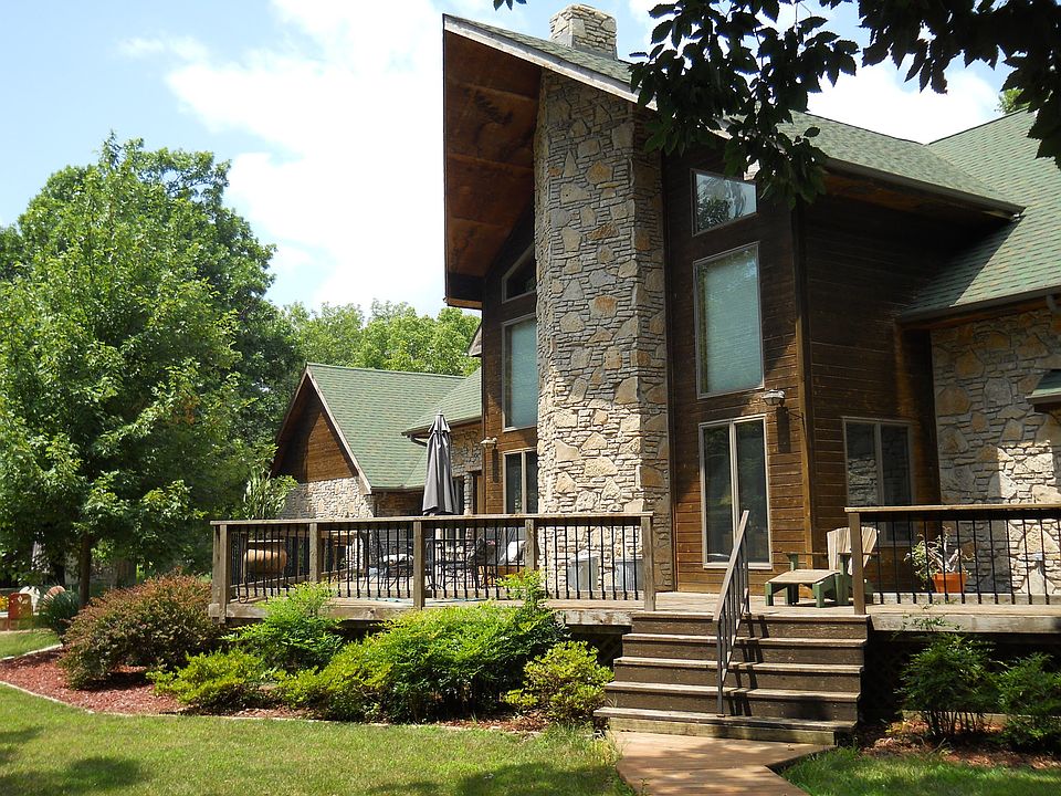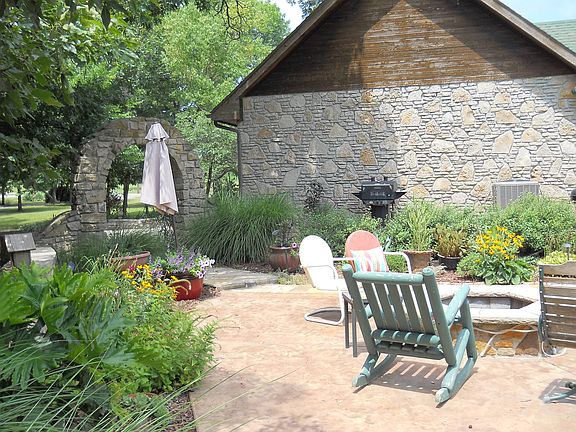 log cabin style, custom wood tongue and groove in entry, great room and kitchen. custom cabinets throughout. architect one of a kind design floor plan, custom rock fireplace with circulating fans to warm entire home, large two car garage and another two car garage and shop detached. third building for storage and treehouse. large oak trees and river view.