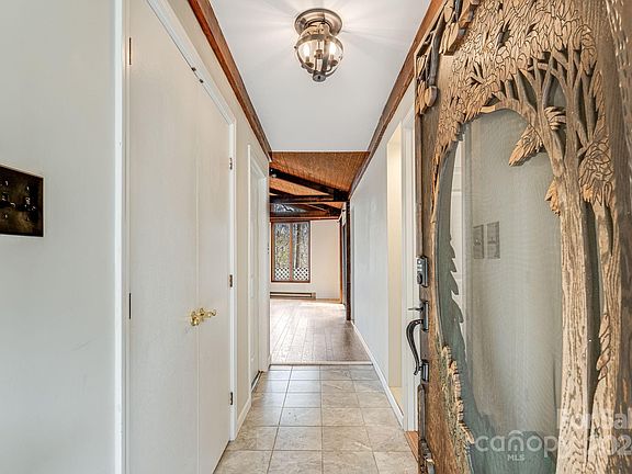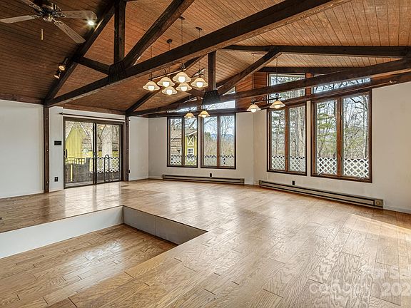 Expansive retro-style ranch home epitomizes distinctive design, featuring a great room with soaring ceilings, tall windows with natural light, and wood flooring. Wood-burning stove includes a decorative copper hood, and the sunken seating area enhances the ambiance for entertaining guests. Kitchen includes stainless-steel appliances and bay window. Layout includes a traditional living room that may serve as an office. Among three main-level bedrooms, two are generously proportioned with the primary bedroom and ensuite bathroom. Basement offers a partially finished space with a heated bonus/sleeping room and half bath. An additional back room presents a myriad of possibilities, providing flexibility for various uses. Spacious garage plus three supplementary outbuildings; one of which is heated by a wood-burning stove with a chimney and blower. Situated within minutes of WCU, SCC, nearby amenities and attractions. This home offers a unique blend of retro charm and modern functionality.