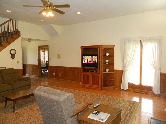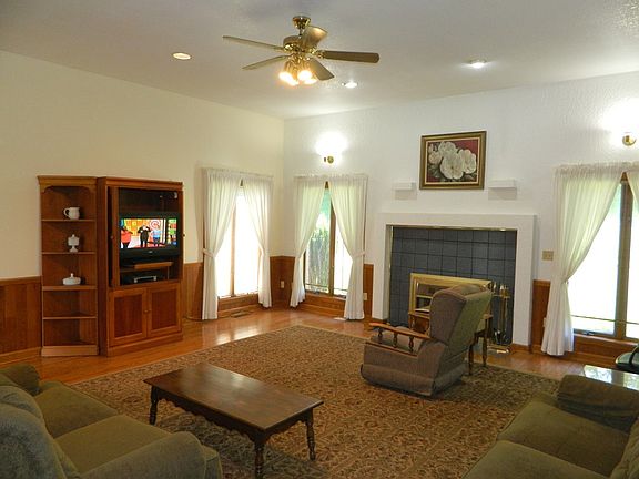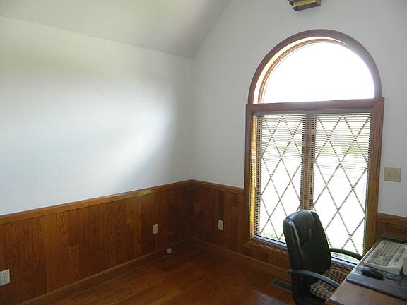 Beautiful and spacious! This 3 BR, 2.5 BA Tudor home offers privacy and beautiful views. Home offers large Living area with fireplace, oak wainscot & trim, hardwood & tile flooring, oak trim & built-ins, wood doors, central vac, & flush lighting throughout home. Owner en suite offers large bedroom space with bay window - bath w/dual tile vanities, jet tub, large shower, massive walk-in closet, dressing/storage area, 2 skylights. Kitchen & dining room offers oak cabinets with double pantries, tile floors & counter tops. Laundry room & half bath off kitchen. Library has custom oak built-in shelving/storage, Sunroom is brick & tile & offers a quite spot to relax. Spacious family area upstairs makes a great media room or could easily be converted to extra bedroom. Attic storage. 12x16 outbuilding. Private back yard. Room for horses & pets on this 4.75 acre parcel. Land is currently being used as hay land. New 35 year architectural shingle roof in process.