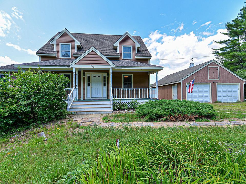 Back on the market with updates and a price reduction! You'll feel at home as soon as you cross the threshold of this 3 bedroom, 2 bath cape-style home, situated on a private 2.14 acre lot. Cross the threshold into a warm welcome that includes oak hardwood flooring in the living spaces and an open floor plan, with brand new stainless steel appliances in the kitchen. Enjoy the view over the expansive back yard from the bright and sunny sunroom. The breezy front porch is a structural hello and also a nice spot for relaxing. The second floor has 3 generous sized bedrooms with plenty of closet space, as well as a shared bath with double sinks. Brand new carpet on 2nd floor, 1st floor office, in the finished basement rooms and both stairways, and freshly painted office and finished basement rooms! Complete with ADT Security System and a standy-by generator for your peace of mind. The full walkout basement has space for a workshop, craft room or storage and is easily reconfigurable to suit your vision. A driveway with ample accommodation for visiting vehicles leads to a detached oversized garage, which also has a loft area for extra storage. Need even more storage? There is also a large shed, with plenty of space to store a vehicle, boat, etc. The generous yard provides plenty of room to enjoy the outdoors. Easy commute to I-93 and the Lakes Region and Gunstock Mountain.