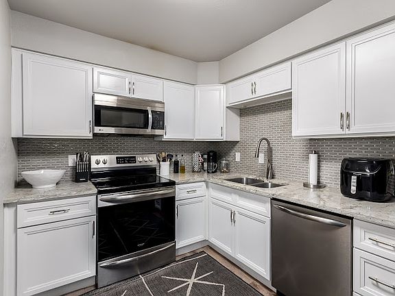 This immaculate property is ready to rent! Lots of light in all main rooms, vaulted ceilings, ceiling fans throughout, beautiful fireplace, private patio, brand new white kitchen cabinets, all stainless steel appliances included, walk- in master closet, both bathrooms nicely upgraded. 1 covered, well lit parking spot and plenty of parking in front of unit. Very safe and beautiful community with wonderful green belt, swimming pools and tennis courts. Pets ok!