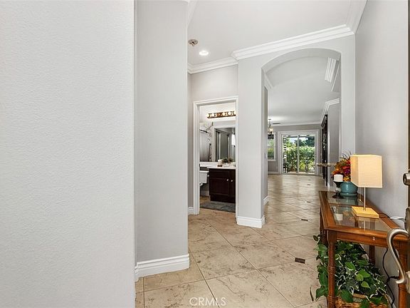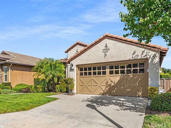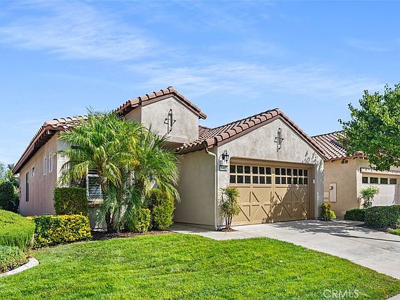 Great opportunity to live in the upscale and meticulously maintained 55+ Community of Trilogy at the foot of the Cleveland National Forest and the Golf Club at Glen Ivy. As you step into the main foyer, you'll immediately notice the light and bright feel with high ceilings and open floorplan in addition to upgraded crown molding, 20-inch ceramic tile, and large baseboards. The open dining and living areas feature plantation shutters which are also throughout the home. A built-in entertainment center is a beautiful focal point of the living room and sliding doors lead to a covered patio with lovely views of the neighborhood below. Heading into the heart of the home, you'll be greeted by the natural light streaming through the kitchen skylight. The kitchen boasts fresh white cabinets, newer stainless-steel appliances, and granite countertops. There's also a spacious pantry and a breakfast bar perfect for casual dining. Located off the kitchen is the laundry room that leads to the garage which has epoxy flooring and an abundance of high end cabinetry for lots of storage! The large primary bedroom offers a ceiling fan, walk-in closet, mounted TV, a walk-in shower, dual sinks, and a private toilet room. The second bedroom, with cozy carpet and ceiling fan is located just off the hallway as you enter and is connected to the second bathroom, which has a new step in soaking tub, and also serves as the guest bath. Ample storage is available with hallway closets near both bedrooms. The entire home has been freshly painted inside and out, adding to the move-in ready appeal. The community’s HOA provides endless amenities, including a golf course, restaurant, fitness center, indoor and outdoor pools, aerobics and dance studio, indoor walking track, tennis courts, craft and meeting rooms, billiard rooms, walking and biking trails, an outdoor amphitheater, RV/boat parking, outdoor patio areas, and much more!