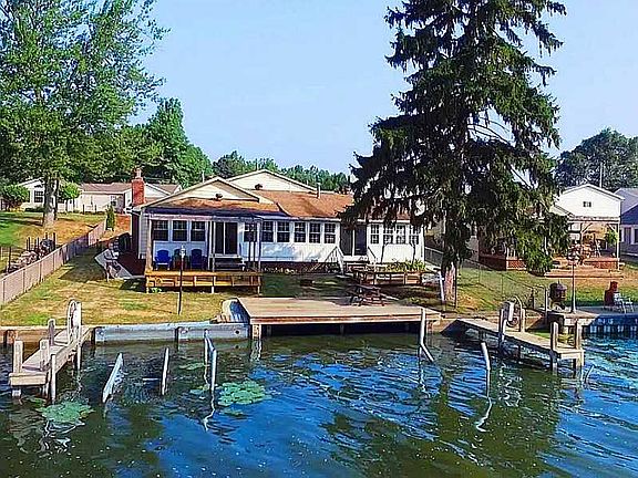 Located on a cul-de-sac waterfront lot with open water view, this well maintained,charming twin single cottage features 3 bedrooms, 1 full bath newer sun room, 2 boat slips & a lift, waterside deck and a detached 2-car garage with a half bath. Remodeled in 1990 and features an open concept living area with newer bathroom, newer tilt-in windows, well, well pump,water softener, wood deck, newly paved parking, & side walk. Short boat ride to the area's famous Tilton Hilton. Next door to another twin single which is also listed and available for purchase.