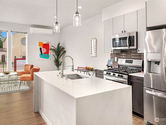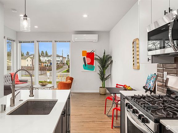 Modern Townhome in the heart of a thriving community near parks, eateries, and shopping. Seamlessly blending a stylish design with everyday comfort, soaring ceilings and expansive windows invite in an abundance of natural light. Entertainment style kitchen with quartz countertops, designer backsplash, full-sized pantry, stainless steel appliances and gas range. High efficiency heating and A/C ductless mini-split and tankless hot water heater. Primary suite on third floor with oversized shower and walk-in closet. The expansive roof top deck with 360 views, is an entertainers delight that is sure to impress. Ample parking all around. Quick access to I-5 and RapidRide line. No HOA.