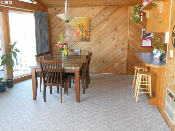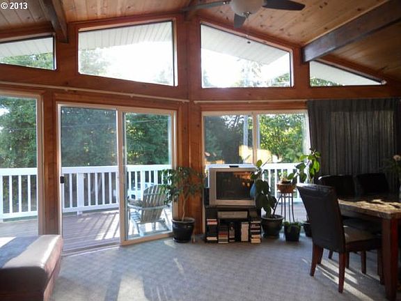 WARM & HOMEY near end of a quiet lane, yet just a block to restaurants, library, store, art center, skate park, creekside park & bayfront pier. Greatroom has vaulted ceiling, huge view deck, blue streaked pine walls, exposed wood beam ceiling. Easy care level yard. Room to park your boat! Lots of updating in recent years including roof & vinyl windows. Efficient & practical woodstove. Fenced yard for Fido.