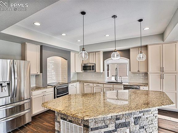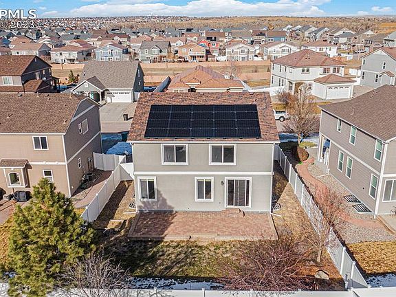 Lovely newer home close to Fort Carson Army Base, Peterson Air Force Base & Schriever Space Force Base in a quiet neighborhood. The bright, open great room is open to the beautiful eat-in kitchen with a large stone-clad island with granite counters, an abundance of cabinet space & chef-quality stainless steel appliances. You’ll love the neutral colors and shiny subway tile back splash that highlights the lovely stove top and double oven. All four of the bedrooms upstairs are generously sized and include a nice desk cubby loft area and laundry upstairs that includes the washer and dryer. The finished basement has a large recreation room and a very spacious fifth bedroom and lovely bathroom. The home has it all including central AC and an energy efficient solar system.