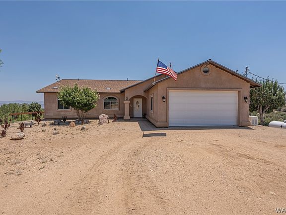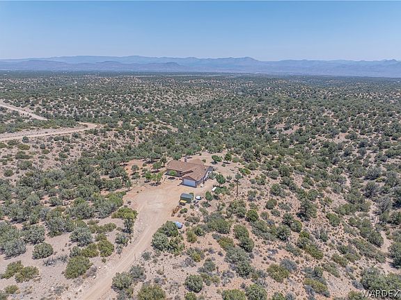 Discover the perfect blend of comfort and nature with this charming 3-bedroom, 2-bathroom home featuring a spacious 2-car garage. Designed with an open split floor plan, this residence sits on 6.99 acres of pristine, prime land, providing ample space and tranquility. Relax on cool nights by the wood-burning fireplace, creating a cozy ambiance. The property is on a shared well, ensuring a reliable water source, and boasts a mature garden, ideal for those with a green thumb. A 20kW generator provides peace of mind with reliable power backup. For added security, the home is equipped with security cameras and a driveway alarm to alert you when company is coming down the road. Explore the beautiful walking trails and enjoy the abundant wildlife that surrounds you. Nestled at the base of the Hualapai Mountains and backed by state land, this property offers breathtaking views of the Peacock Mountains, Cottonwood Mountains, Aquarius Mountains, and Hualapai Mountains. Don't miss this rare opportunity to own a slice of paradise!