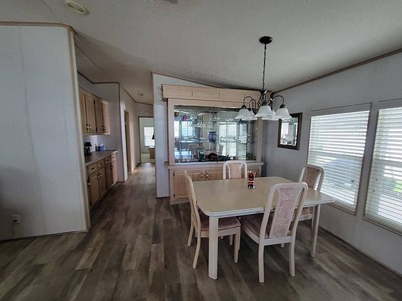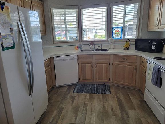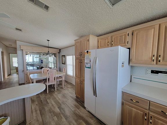 This lovely 1993 Palm Harbor 2 bedroom, 2 bath home has 1,248 square feet. The home is located on a quiet street with a double-wide driveway which allows for multiple vehicle parking and ample room to access the golf cart shed. The home features updated Jeld-Wen double pane windows, new blinds, laminate flooring and Berber carpet in the bedrooms. The home has an open floor plan, skylights, updated appliances including a new refrigerator, dishwasher and washing machine. The master bedroom is quite spacious and can easily accommodate a king size bed. The master bedroom has a large walk-in closet and the master bath has double vanities and a shower. The guest bedroom has twin beds and a sizeable closet while the guest bath has a shower stall. The dining room has built-ins and there are additional cabinets for extra storage in the hallway. The air conditioner was replaced in 2018 and a new galvanized metal roof was installed in January 2022. The east-facing lanai has vinyl windows and is a nice place to relax in the afternoon. The home is offered turnkey and includes a golf cart and a new gas grill. This home has everything you'll need and then some! Just bring your personal possessions and start living your best life in this resort-style MH community. The home is listed for $135,000.00 and is on leased land where monthly lot leases range from $900.00 and up (excluding Ad Valorem tax and garbage service.) The fees include the use of two pools, two hot tubs, a fitness center, tennis courts, bocce ball courts, pickleball and horseshoes and access to the clubhouse. The community also has a Bar & Grill onsite which features daily specials and monthly entertainment. Lawn mowing, biweekly trash pickup and a 24 Hour manned guard gate are also included. The community has 2 Golf courses. An 18-hole South Championship Course and the par 60 North Executive course where you may purchase a membership or a 'pay as you play' option.
