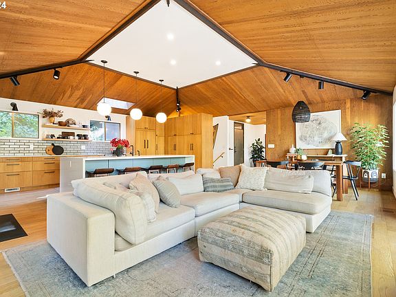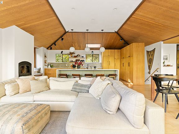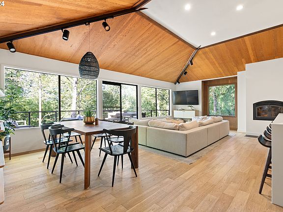 Sublime NW Regional Modern - unique custom design with interiors updated by the current designer owner.The gable covered walkway leads you into the home where vaulted ceilings with natural wood details stun upon entering. The wall of windows brings the outdoors in, flooding the space with natural light and overlooks the lush forested lot. The main living space is open and airy with the beautifully updated kitchen that features designer tile & fixtures, custom cabinetry, upper end appliances and a large quartz island for cooking projects and entertaining. The adjacent living/dining space has a cozy modern wood burning fireplace, built in reading nook and a sliding glass door to connect to the outdoor deck living space that floats at tree level providing views of the serene green space. The primary bedroom is on the main floor with vaulted ceilings, beautiful wood paneling, glass doors that lead to a private deck and an adjacent laundry area. The primary connects to the main floor spa-like bath with limestone floors, walls of Japanese tile, designer lighting, custom cabinetry, a soaking tub, high wood ceilings with a skylight creating a soothing space full of natural light.The lower level has 2 bedrooms with 1 full bath, a large living space with custom built-ins for entertainment and office space connected to another deck that has access to the yard. A large workshop is connected to the lower level living space perfect for a studio, workshop or gym. Finishes featured throughout: wood floors, Ann Sacks & Cle tile, Schoolhouse hardware + light fixtures, Noguchi/DWR/Cedar&Moss lighting. This beautiful, turnkey one of a kind home is sited beautifully into the private .48 acre lot for maximum privacy.Premium accessibility located within minutes to Multnomah Village restaurants + shopping,parks, freeway access. [Home Energy Score = 4. HES Report at https://rpt.greenbuildingregistry.com/hes/OR10233494]